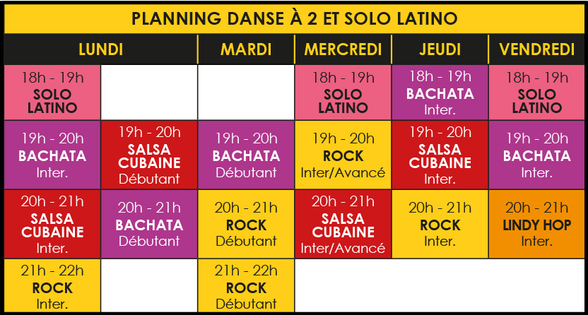 - NIVEAU INTER./AVANCÉ : vous pratiquez en cours depuis au moins trois années .Vous maitrisez de nombreuses variations, vous avez un bon guidage et une bonne connexion et vous savez vous exprimer sur différents rythmes musicaux en cours et en soirées. Donc dans ce niveau vous continuerez à découvrir de nouvelles figures et l'accent sera mis d'avantage sur la fluidité de la danse, l'attitude, le placement, sans oublier le guidage et la connexion.